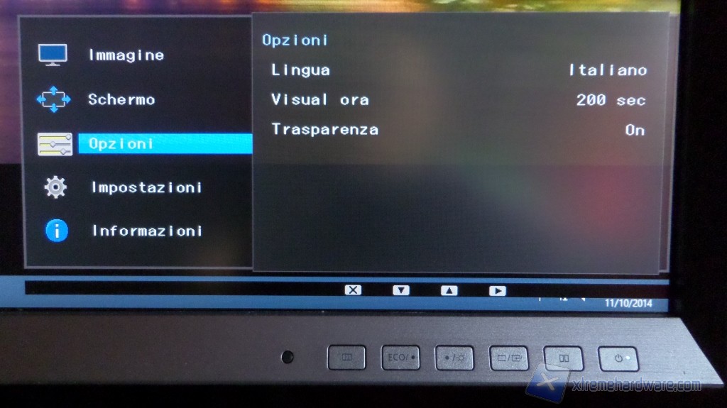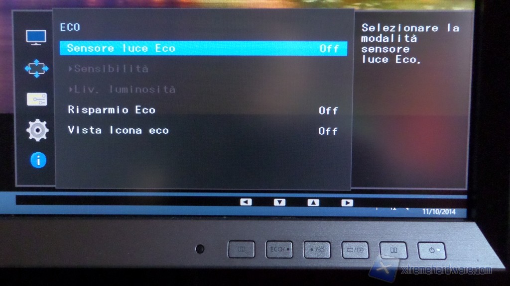 Il menù Opzioni è abbastanza esplicativo e passiamo allora al successivo: Impostazioni. Tra le funzioni più importanti c’è la modalità Eco. Nel sottomenù si potrà attivare l’opzione Sensore luce Eco che regola la retroilluminazione a seconda della luce ambientale. Si potrà variare la sensibilità (se far aumentare e/o diminuire in modo più o meno marcato la retroilluminazione) e modificare il livello di luminosità se le variazioni automatiche tendono ad abbassare troppo o troppo poco l’intensità dei LED.